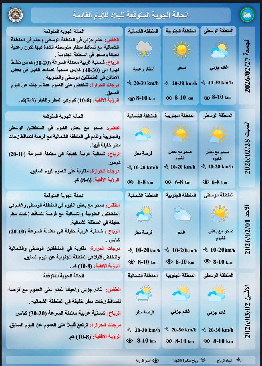المنطقة الشمالية مع تساقط امطار متوسطة الشدة فيها تكون رعدية احياناً وصحو في