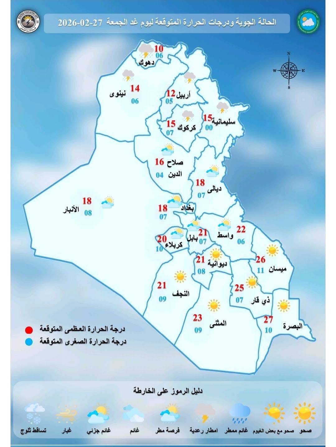 السومرية نيوز ، ان "الطقس يوم غد الجمعة سيكون غائما جزئيا في المنطقة الوسطى وغائم في