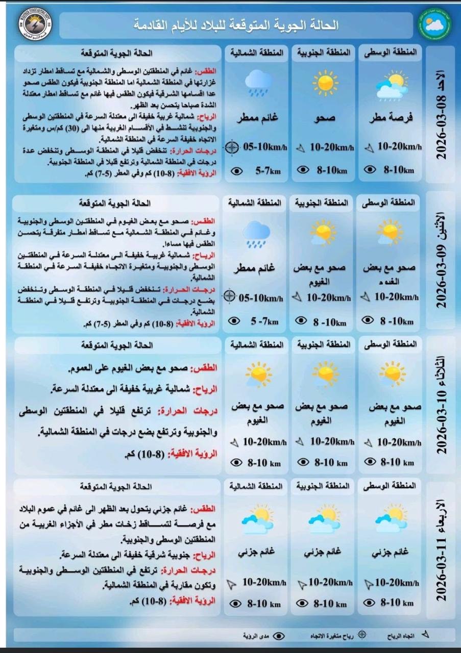 المنطقة الجنوبية صحواً عدا أقسامها الشرقية فيكون غائماً مع أمطار متوسطة الشدة صباحاً تتحسن بعد الظهر، و درجات الحرارة تنخفض في المنطقتين الوسطى و الشمالية، وترتفع قليلاً في المنطقة الجنوبية".