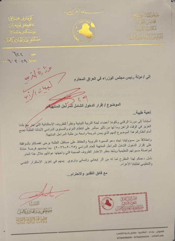 وعزا النائب الطلب في كتابه تلقته "بغداد اليوم" الى "الظروف الاستثنائية التي يمر بها البلد وتأثيرها المباشر على انتظام الدوام والمستوى الدراسي للطلبة، والاقتراح بالدخول الشامل أمام أنظار رئاسة الوزراء كونه يمس شريحة واسعة من الطلبة".