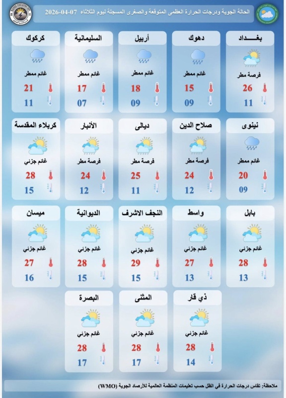 توقعت هيئة الأنواء الجوية، اليوم الثلاثاء ( 7 نيسان 2026 )، أن يكون الطقس صحواً ترافقه الغيوم في المنطقتين الوسطى والجنوبية مع زخات مطر خفيفة، فيما ترتفع درجات الحرارة حيث تكون الاجواء باردة نسبيا خلال ساعات الصباح والليل، مائلة للاعتدال نهاراً.