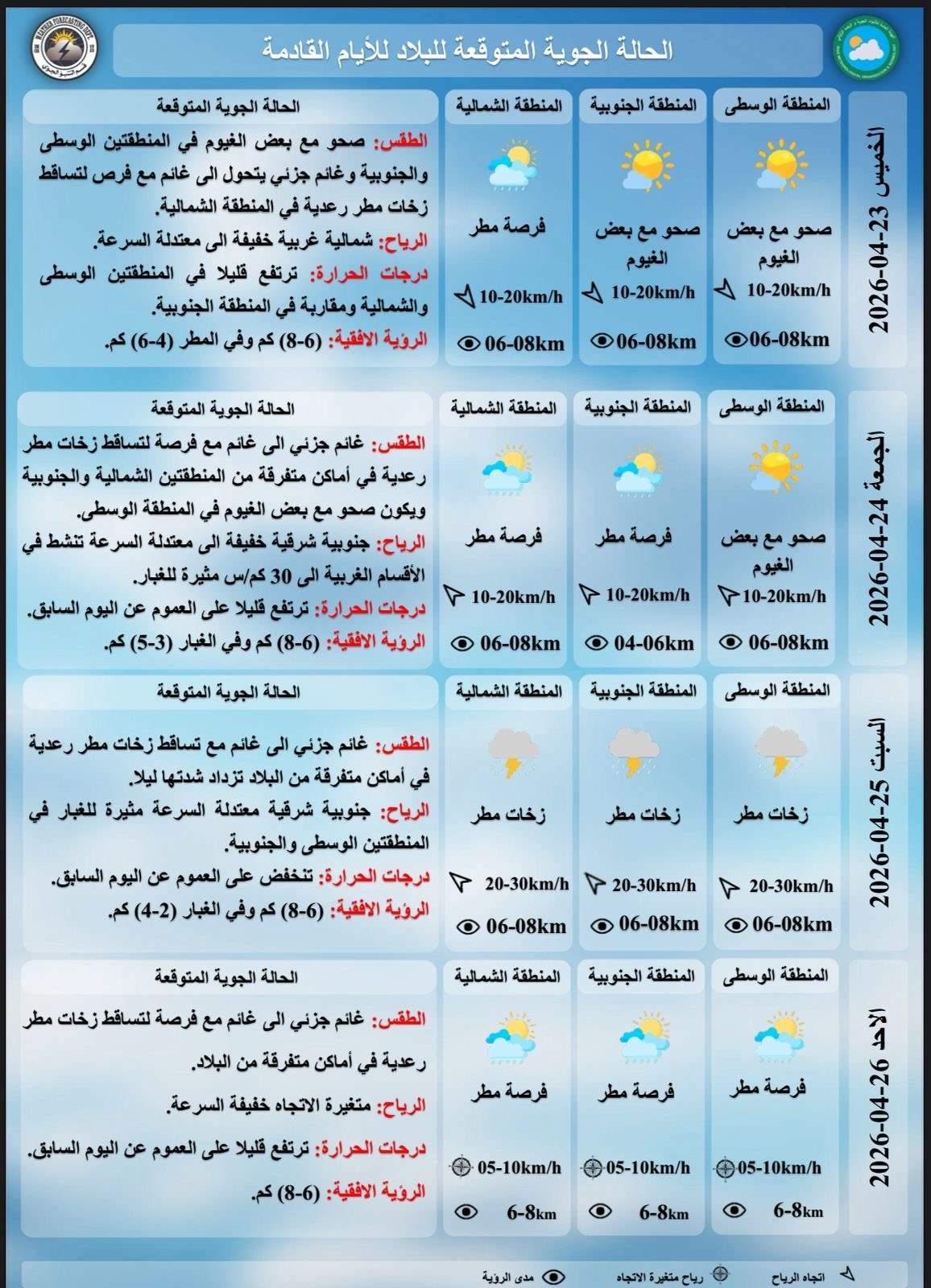 وأضافت أن "طقس يوم الجمعة سيكون غائماً جزئياً إلى غائم مع فرصة لتساقط زخات مطر رعدية في أماكن متفرقة من المنطقتين الشمالية والجنوبية، ويكون صحواً مع بعض الغيوم في المنطقة الوسطى، والرياح جنوبية شرقية خفيفة الى معتدلة السرعة تنشط في الأقسام الغربية الى 30 كم/س مثيرة للغبار، ودرجات الحرارة ترتفع قليلاً على العموم عن اليوم السابق"، مشيرة الى ان "طقس يوم السبت سيكون غائماً جزئياً إلى غائم مع تساقط زخات مطر رعدية في أماكن متفرقة من البلاد تزداد شدتها ليلاً، ودرجات الحرارة تنخفض على العموم عن اليوم السابق، والرؤية الأفقية (6-8) كم وفي الغبار (2-4) كم".