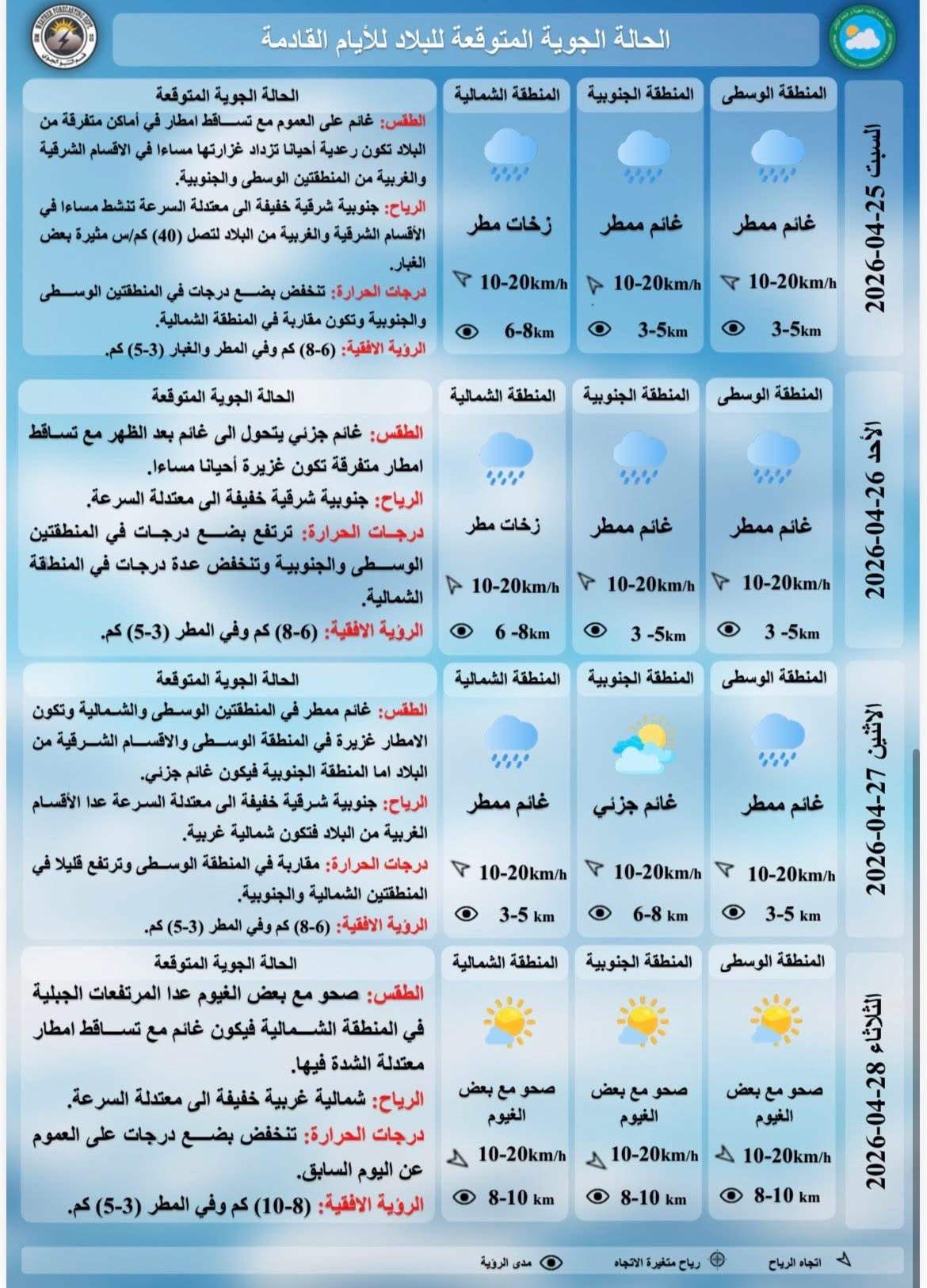 وقال الهيئة في بيان ورد لـ السومرية نيوز ، أن "طقس يوم غد السبت سيكون غائماً على العموم، مع تساقط أمطار في أماكن متفرقة من البلاد وتكون رعدية احياناً وتزداد غزارتها مساء في الأقسام الشرقية والغربية من المنطقتين الوسطى والجنوبية، والرياح جنوبية شرقية خفيفة الى معتدلة السرعة تنشط مساء في الأقسام الشرقية والغربية من البلاد مثيرة بعض الغبار، ودرجات الحرارة تنخفض بضع درجات في المنطقتين الوسطى والجنوبية ومقاربة في المنطقة الشمالية ".