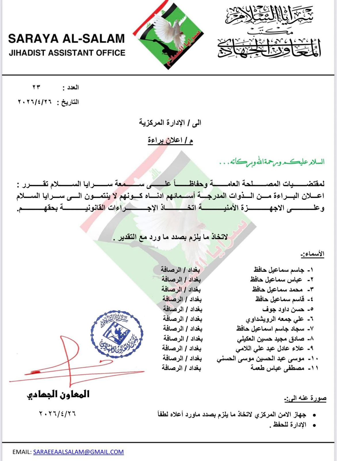 مديرية الإعلام المركزي في بيان، "لمقتضيات المصلحة العامة وحفاظاً على سمعة سرايا السلام تقرر اعلان البراءة من الذوات المدرجة أسمائهم ادناه كونهم لا ينتمون الى سرايا السلام".