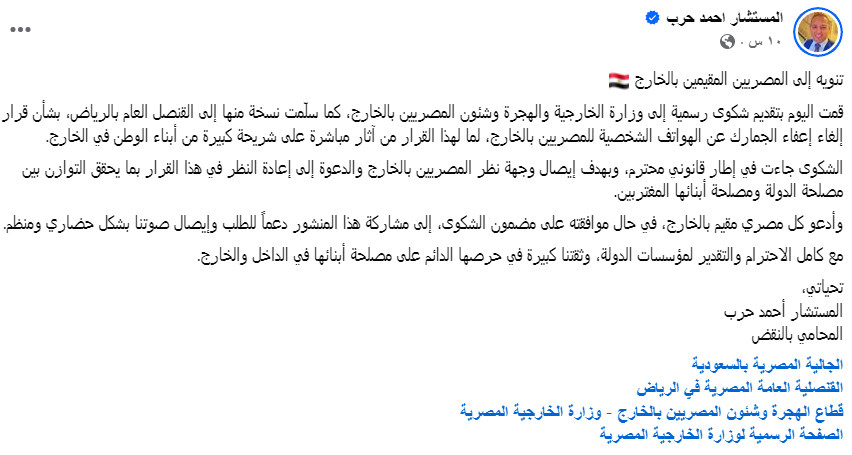 وأوضح حرب عبر صفحته الرسمية على موقع التواصل الاجتماعي فيسبوك أن الشكوى قُدمت في إطار قانوني وحضاري، بهدف إيصال صوت الجالية المصرية بالخارج ودعوة الجهات المعنية إلى إعادة النظر في القرار، بما يحقق توازنًا عادلًا بين مصلحة الدولة وحقوق أبنائها المغتربين.
