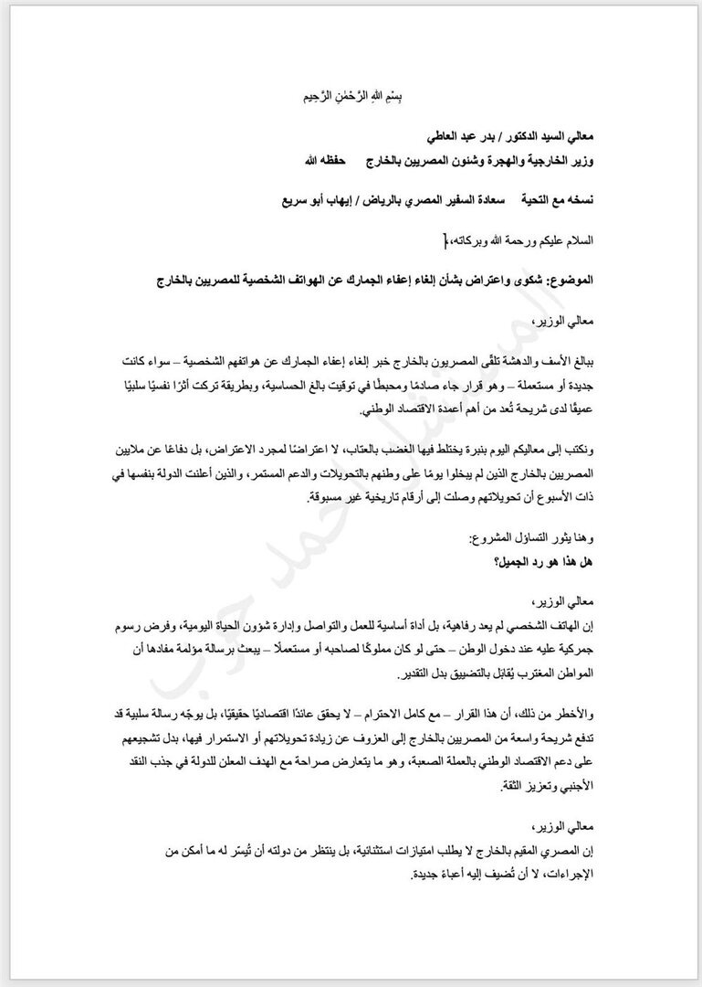 تقدم أحمد حرب، وهو محام مصري مقيم في المملكة العربية السعودية، بشكوى رسمية إلى وزارة الخارجية والهجرة وشؤون المصريين بالخارج، احتجاجا على إلغاء الإعفاء الجمركي عن الهواتف المحمولة.