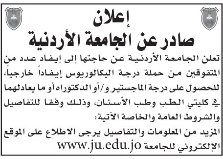 الوكيل الإخباري- أعلنت الجامعة الأردنية عن حاجتها لإيفاد عدد من المتفوقين من حملة درجة البكالوريوس للدراسة خارج الأردن، بهدف الحصول على درجة الماجستير و/أو الدكتوراه أو ما يعادلهما، وذلك لكلٍّ من كليتي الطب وطب الأسنان.