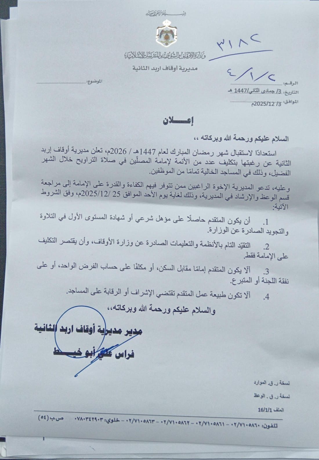 الوكيل الإخباري- مجدي الباطية - أعلنت مديرية أوقاف إربد الثانية عن فتح باب التسجيل للراغبين في إحياء شعيرة صلاة التراويح خلال شهر رمضان المبارك لعام 1447هـ / 2025، في المساجد التي لا يتوفر فيها أئمة أو موظفون رسميون.
