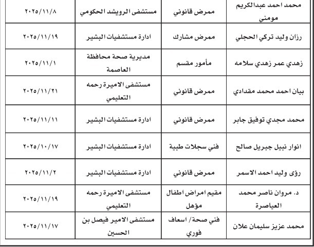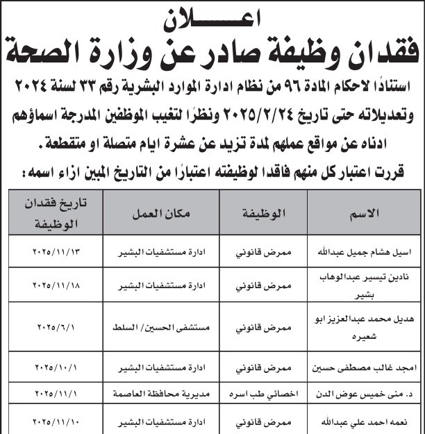 الوكيل الإخباري- قررت وزارة الصحة اعتبار الموظفين المدرجة أسماؤهم أدناه فاقدين لوظائفهم، وذلك بسبب تغيبهم عن مواقع عملهم لمدة تزيد على عشرة أيام متواصلة أو متقطعة، استنادًا إلى أحكام المادة (96) من نظام إدارة الموارد البشرية رقم (33) لسنة 2024 وتعديلاته، وذلك حتى تاريخ 24/2/2025.