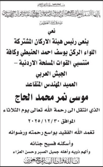 الوكيل الإخباري- ينعى رئيس هيئة الأركان المشتركة اللواء الركن يوسف أحمد الحنيطي، وكافة منتسبي الجيش، العميد المتقاعد موسى نمر محمد الحاج الذي انتقل إلى رحمة الله تعالى.