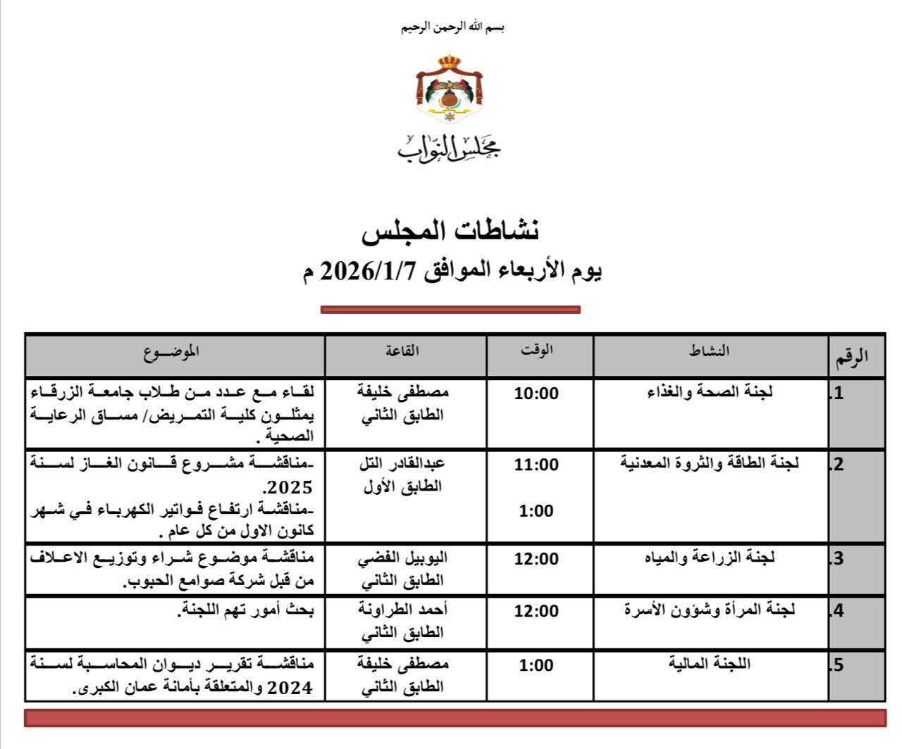 ويسبق ذلك بساعتين فقط مواصلة مناقشة اللجنة لمشروع قانون الغاز لسنة 2025، في وقت تناقش فيها اللجنة المالية النيابية، تقرير ديوان المحاسبة وملاحظاته المتعلقة بأمانة عمان الكبرى.