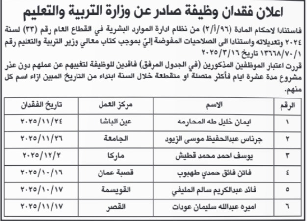 وزارة التربية والتعليم قرارًا، استنادًا إلى أحكام المادة (96/أ/2) من نظام الخدمة المدنية لسنة 2024، يقضي باعتبار الموظفين المذكورين في الجدول المرفق أدناه فاقدين لوظائفهم.