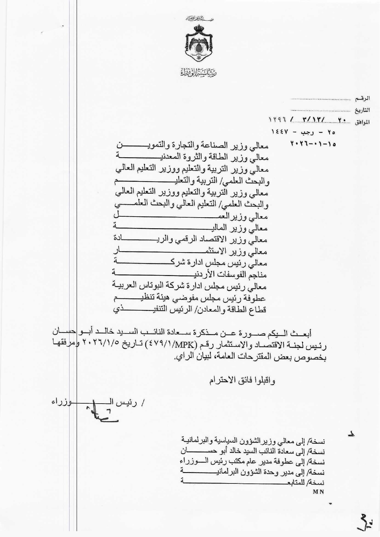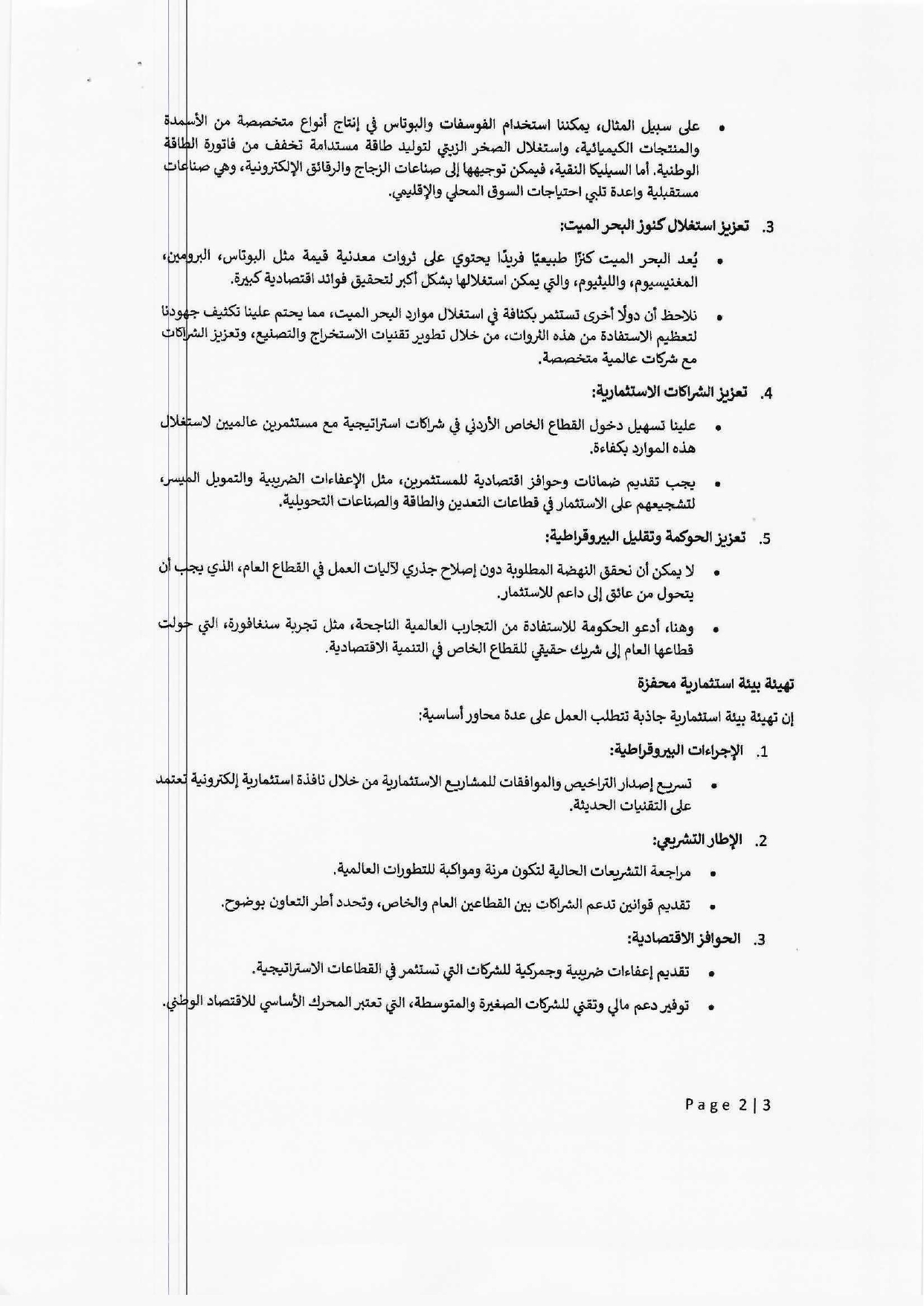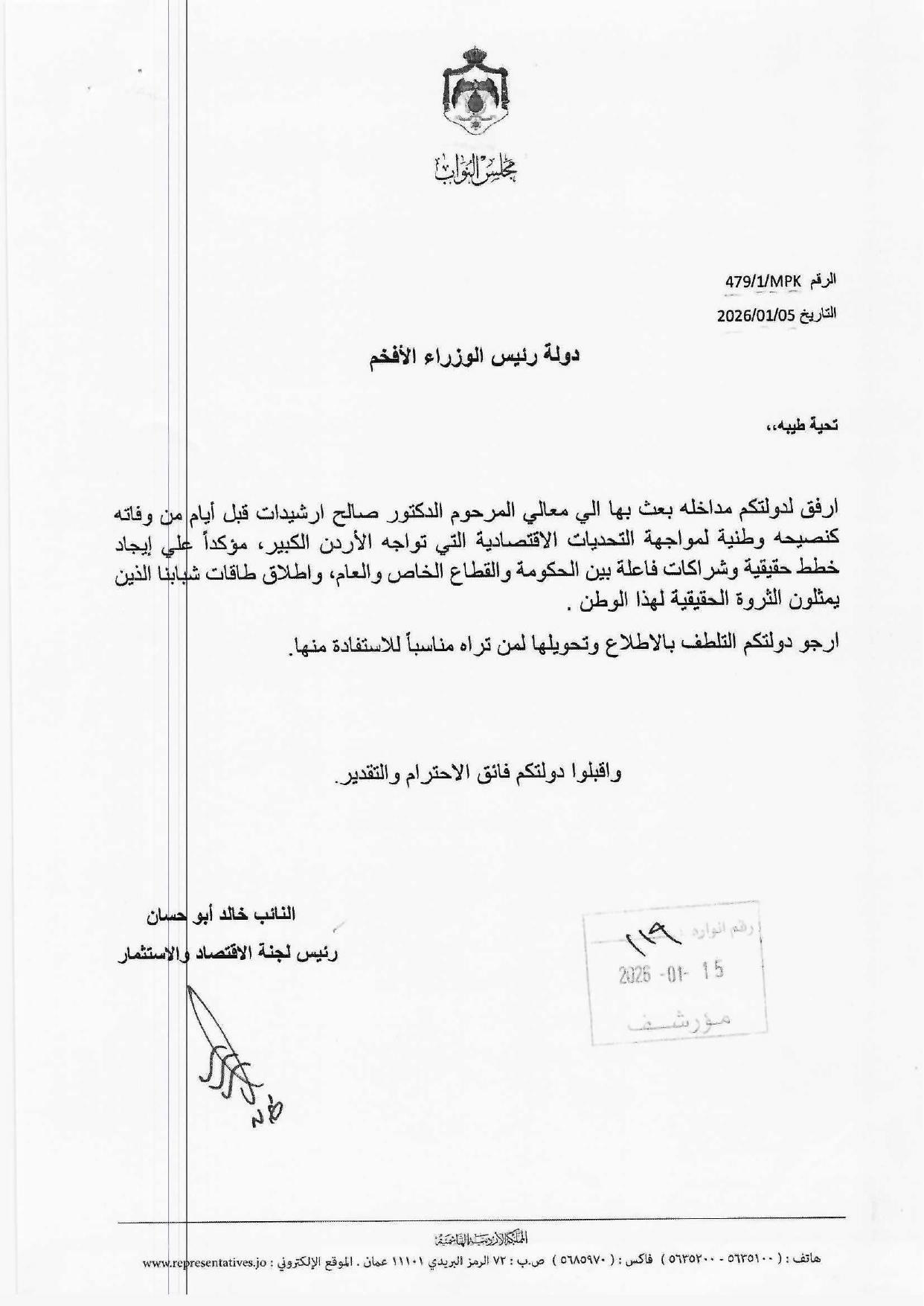 التوصيات بعث بها رئيس لجنة الاقتصاد والاستثمار النيابية النائب خالد أبو حسان بموجب مذكرة رسمية إلى دولة رئيس الوزراء وسلمت رسميا تدعو إلى انتقال جذري من “سياسات الشعارات” إلى خطط الشراكة الحقيقية.
