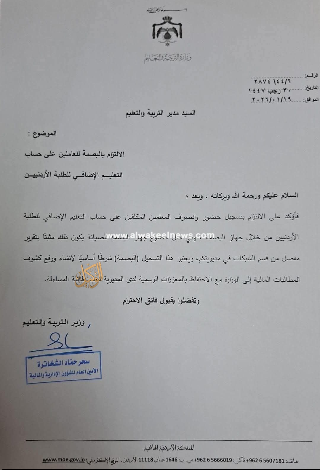 ووفق التعميم الذي اطلع عليه "الوكيل الإخباري"، فإن الالتزام بجهاز البصمة يعتبر شرطا أساسيا لغايات إنشاء ورفع كشوف المطالبات المالية الشهرية إلى مركز الوزارة.