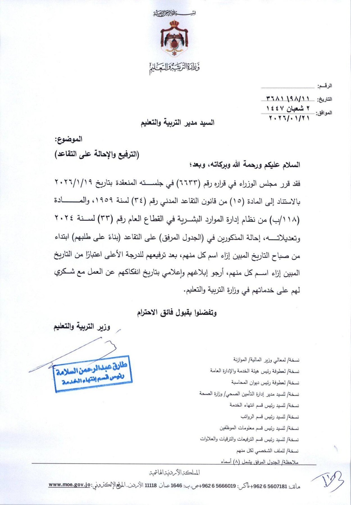 الوكيل الإخباري- قرر مجلس الوزراء الموافقة على إحالة الموظفين المذكورين تالياً بعد ترفيعهم للدرجة الأعلى إلى التقاعد بناء على طلبهم.