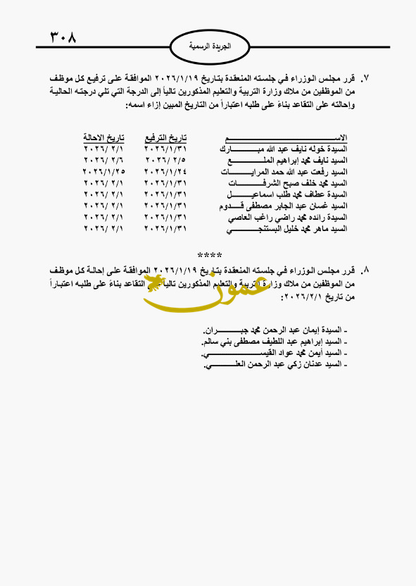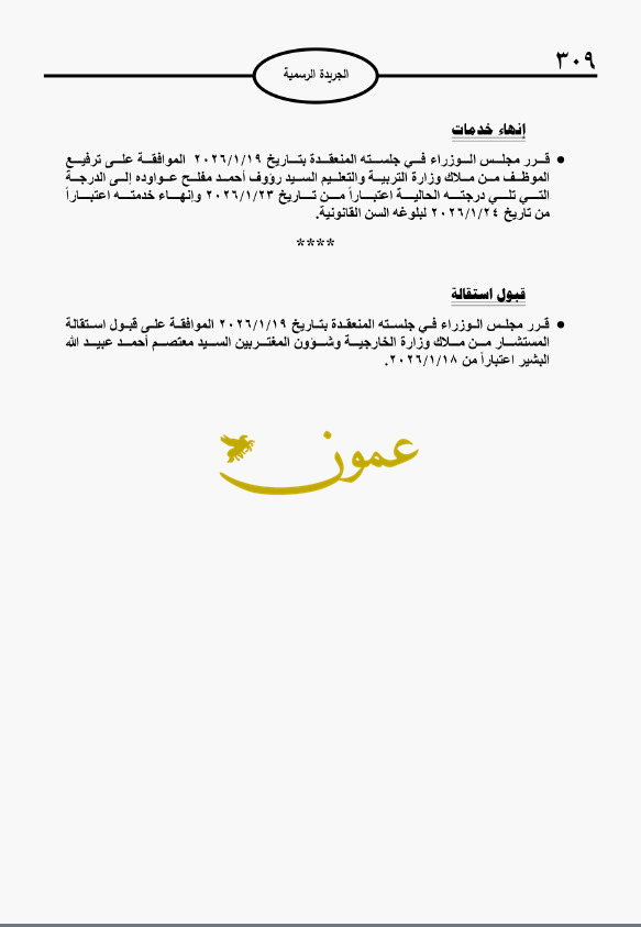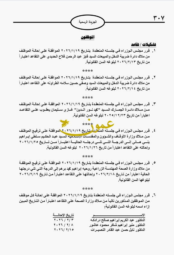 عمون - قرر مجلس الوزراء ، قبول استقالة معتصم احمد عبيدالله البشير من ملاك وزارة الخارجيةكما تقرر ترفيع وإحالة عدد من الموظفين في عدد من الوزارات والدوائر إلى التقاعد.وتاليا الأسماء:
