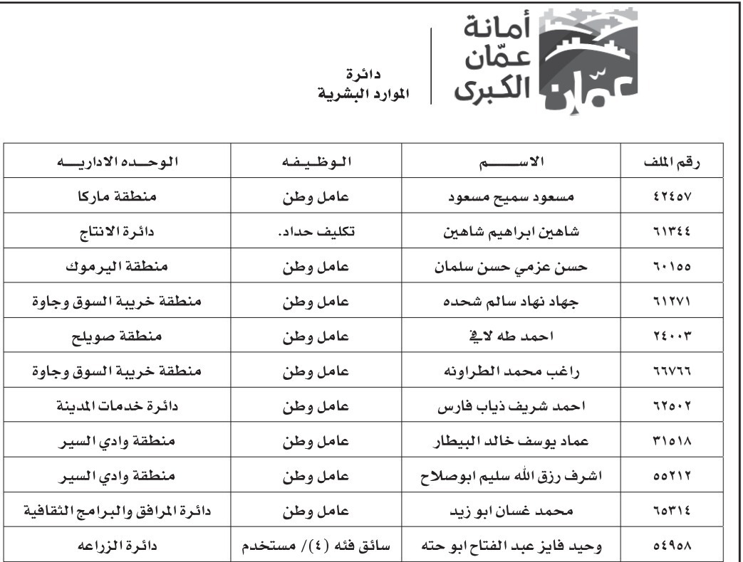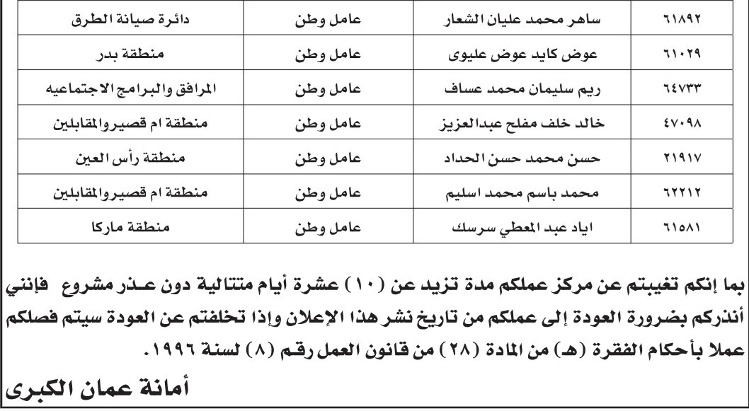 الوكيل الإخباري- أنذرت أمانة عمان الكبرى اليوم الاحد الموظفين المذكورة أسماؤهم أدناه، المتغيبين عن مراكز عملهم مدة تزيد على عشرة أيام متتالية دون عذر مشروع، بضرورة العودة إلى عملهم تجنباً للفصل من العمل، عملا بأحكام قانون العمل".