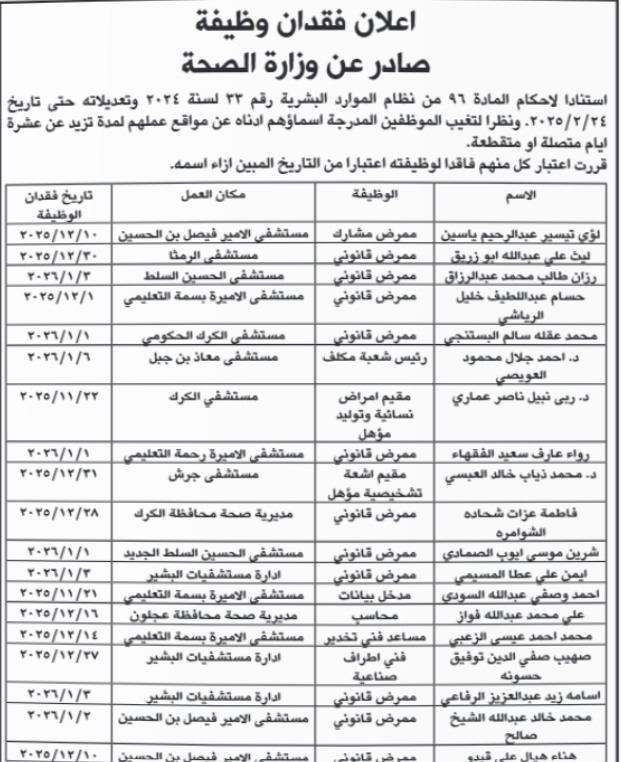 الوكيل الإخباري- أعلنت وزارة الصحة عن فقدان عدد من الموظفين لوظائفهم، وذلك استناداً لأحكام المادة (96) من نظام إدارة الموارد البشرية رقم (33) لسنة 2024 وتعديلاته حتى تاريخ 24 فبراير 2025، وذلك بسبب التغيب غير المبرر عن مواقع العمل لمدة تزيد عن عشرة أيام، سواء كانت متصلة أو متقطعة.