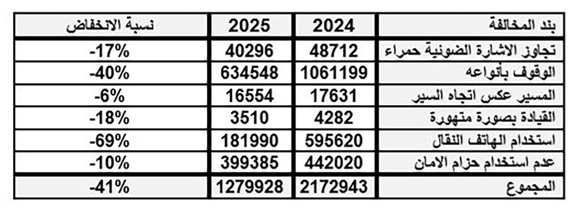 وناقش المجلس أيضاً نتائج برامج التوعية المرورية وإنفاذ القانون، وأثرها الإيجابي على السلوكيات المرورية، والتي انعكست من خلال انخفاض ملحوظ في المخالفات التي تهدد حياة مستخدمي الطرق وتزيد من الازدحامات المرورية، وفقا لما يوضحه الجدول التالي: