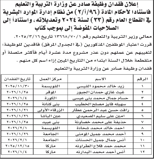 الوكيل الإخباري- أعلنت وزارة التربية والتعليم اليوم الاثنين عن فقدان عدد من الموظفين لوظائفهم، وذلك استنادًا إلى أحكام المادة (96/أ/2) من نظام إدارة الموارد البشرية في القطاع العام رقم (33) لسنة 2024 وتعديلاته، وبموجب الصلاحيات المخولة للوزارة بموجب كتاب رسمي صادر عن الوزير.