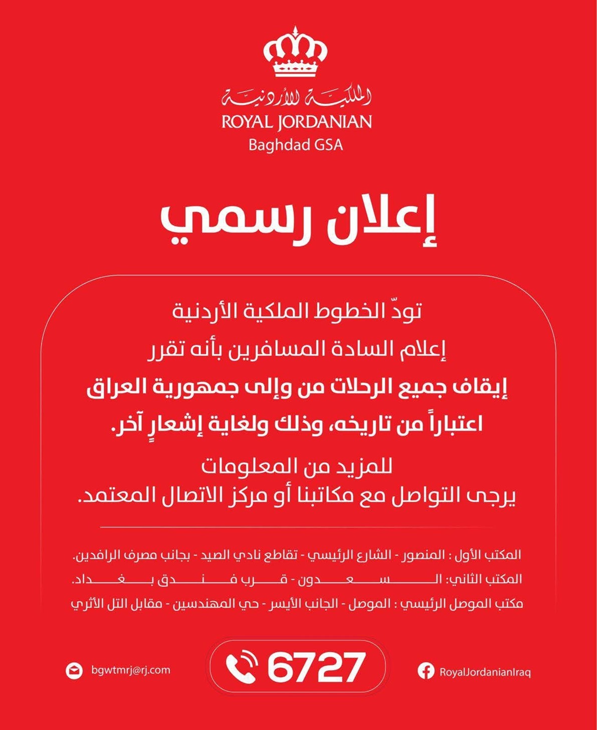 الوكيل الإخباري- أعلنت شركة الخطوط الجوية الملكية الأردنية أنه تقرر إيقاف جميع الرحلات من وإلى جمهورية العراق اعتباراً من تاريخه، وذلك ولغاية إشعارٍ آخر.