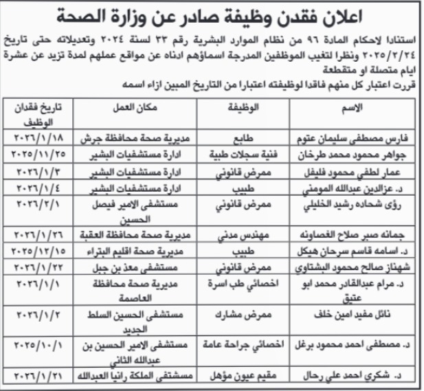 الوكيل الإخباري- أعلنت وزارة الصحة عن فقدان عدد من الموظفين لوظائفهم، وذلك استناداً لأحكام المادة (96) من نظام إدارة الموارد البشرية رقم (33) لسنة 2024 وتعديلاته حتى تاريخ 24 فبراير 2025، وذلك بسبب التغيب غير المبرر عن مواقع العمل لمدة تزيد عن عشرة أيام، سواء كانت متصلة أو متقطعة.