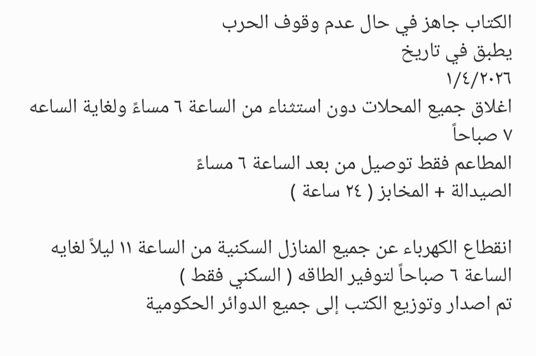 الوكيل الإخباري- نفت مصادر حكومية وجود خطط أو كتب رسمية بشأن إغلاق المحلات والأسواق خلال فترات المساء وقطع مبرمج للكهرباء عن المنازل إذا استمرت الحرب إلى ما بعد 1 نيسان المقبل.