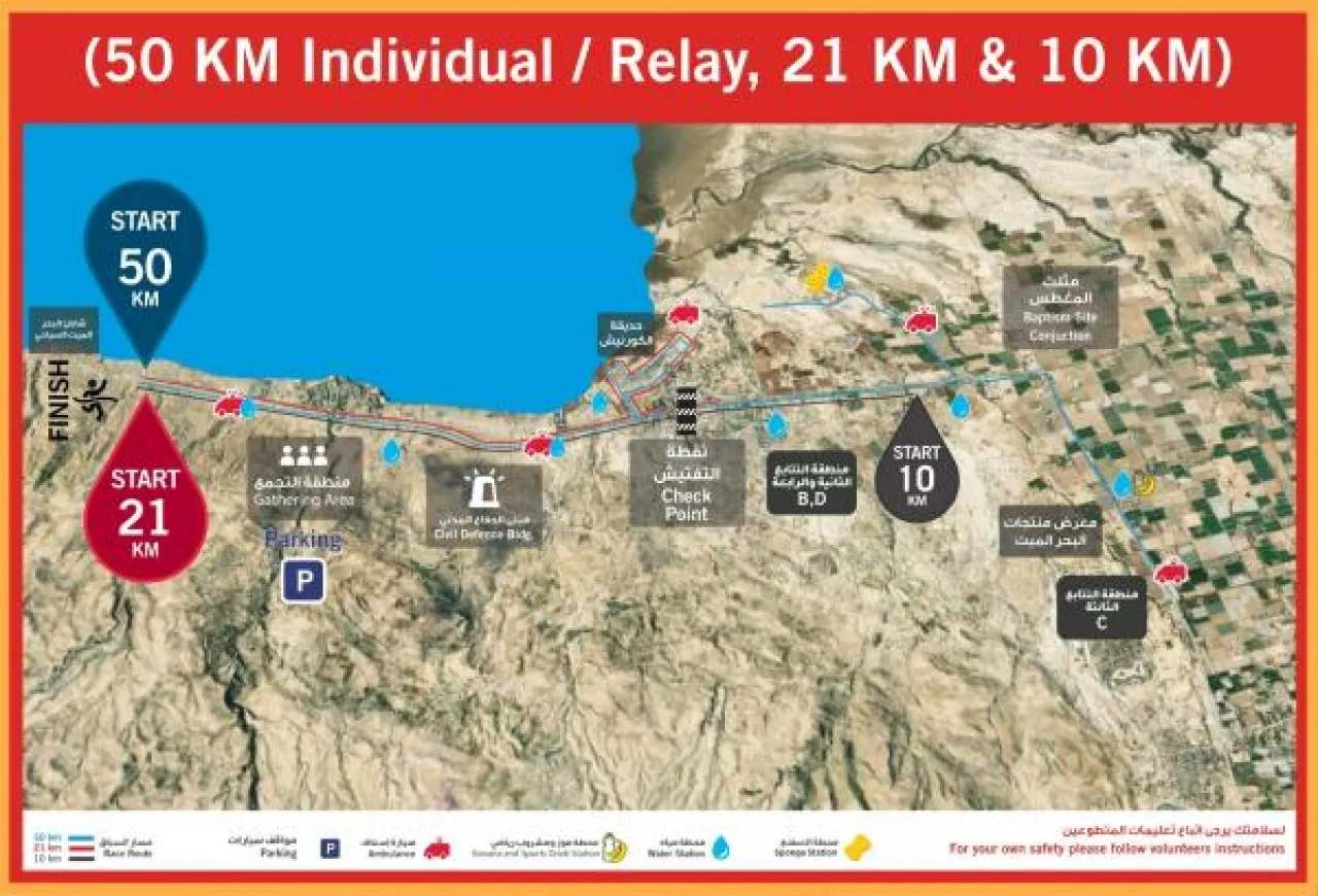 ويتضمن الحدث ثلاث سباقات رئيسية، حيث ينطلق سباقا 50 كم ألترا ماراثون (فردي/تتابع) و21 كم نصف ماراثون عند الساعة 6:00 صباحاً من مقابل شاطئ عمّان السياحي، فيما ينطلق سباق 21 كم لذوي الإعاقة عند الساعة 6:10 صباحاً من نفس الموقع، بينما ينطلق سباق 10 كم عند الساعة 9:00 صباحاً من بعد 2 كم من مثلث المغطس.