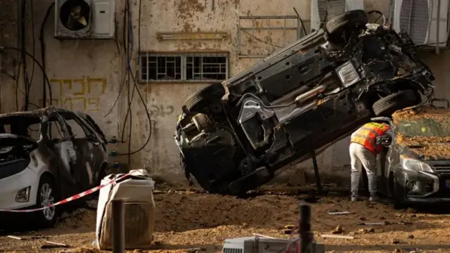 وتُظهر الصور سيارة مقلوبة، وانتشار الحطام في المكان، فضلاً عن فجوة كبيرة في جانب أحد المباني السكنية.