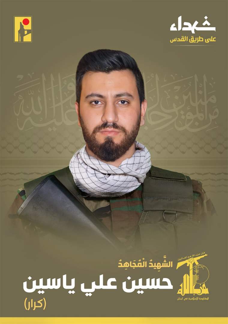 "بمزيد من الفخر والإعتزاز، تزف المقاومة الإسلامية الشهيد المجاهد حسين علي ياسين "كرار" مواليد عام 1993 من بلدة السلطانية في جنوب لبنان، والذي ارتقى شهيداً على طريق القدس".