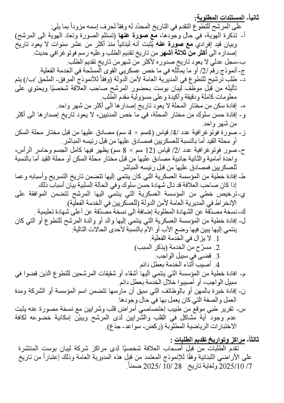 بدأت المديرية العامة لأمن الدولة بقبول طلبات التطوّع برتبة مأمور متمرّن من 7 ولغاية 28 تشرين الأول في كافة مكاتب "ليبان بوست" على الأراضي اللبنانية ، دون التقيد بأحرف الأسماء.