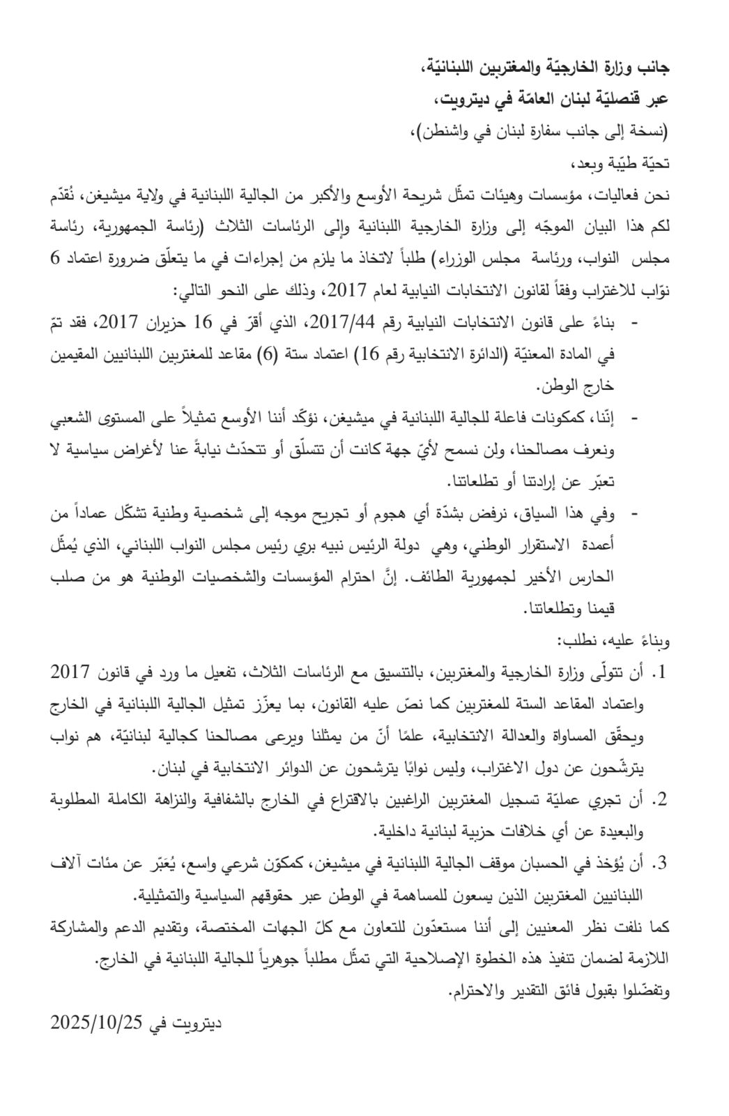 وجهت مؤسسات الجالية اللبنانيّة في ميشيغن وفاعليّاتها رسالة إلى وزارة الخارجيّة والمغتربين والرئاسات الثلاث، أعربت فيها عن موقفها المؤيّد لإجراء الانتخابات النيابيّة للعام 2026 على أساس قانون العام 2017 كما هو، في الشّق الذي يتعلّق باقتراع المُغتربين للمقاعد الستّة المُخصّصة لغيْر المُقيمين.