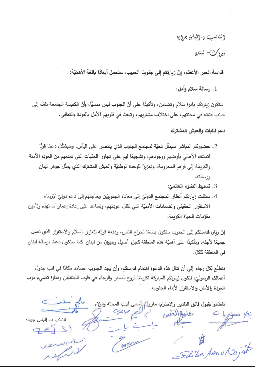 جنوب لبنان خلال زيارته المرتقبة للبنان، مرفقاً الدعوة برسالة موقعة من النواب: إبراهيم منيمنة، حليمة قعقور، نجاة صاليبا،