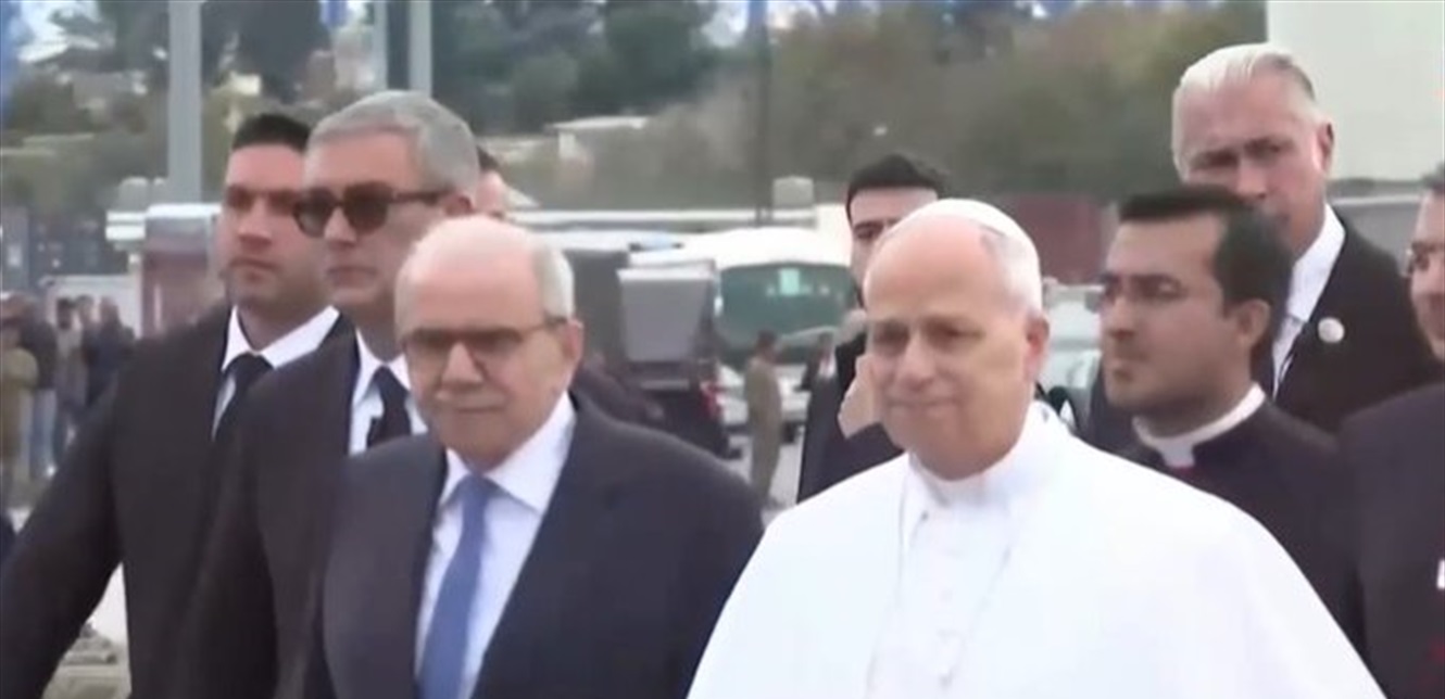 البابا لاوون الرابع عشر في باحة الدير، ضمن اليوم الثالث والأخير من زيارته إلى