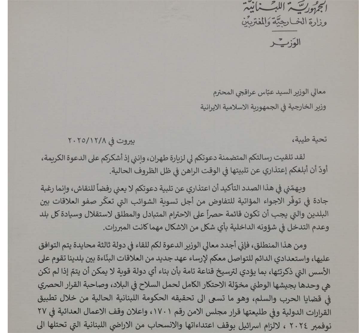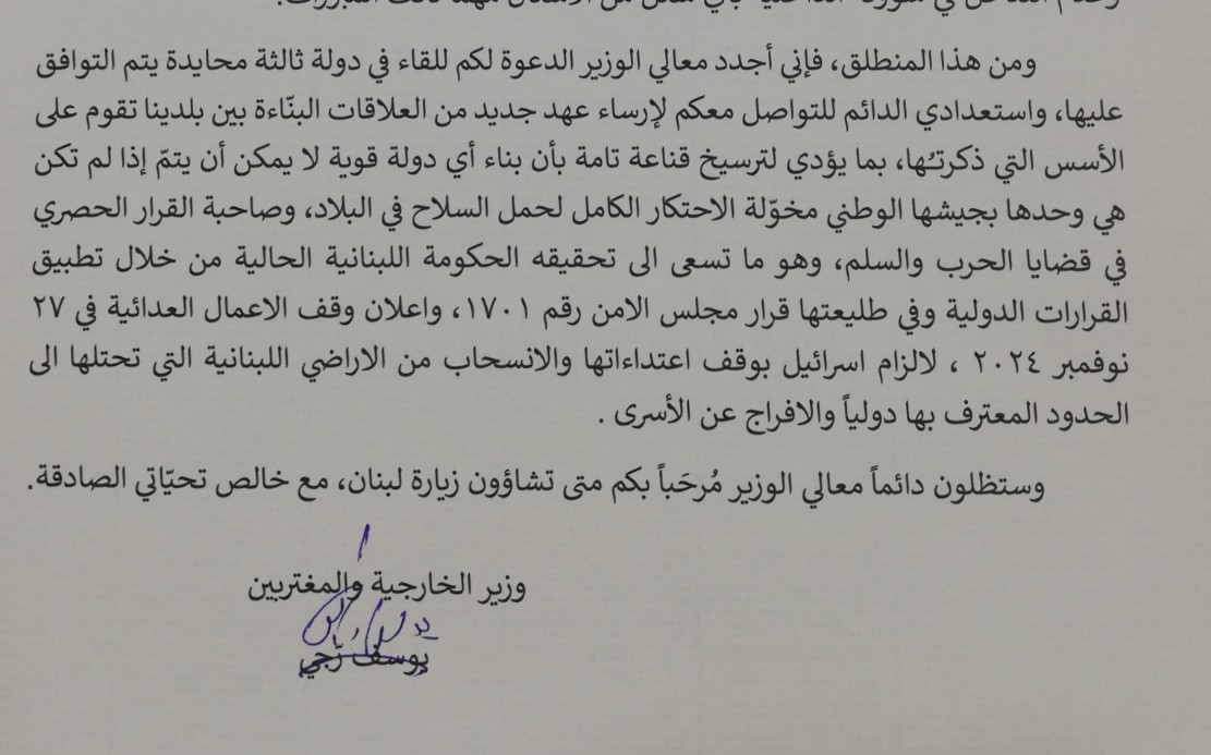 لبنان ٢٤" نص رسالة الوزير رجي الجوابية.