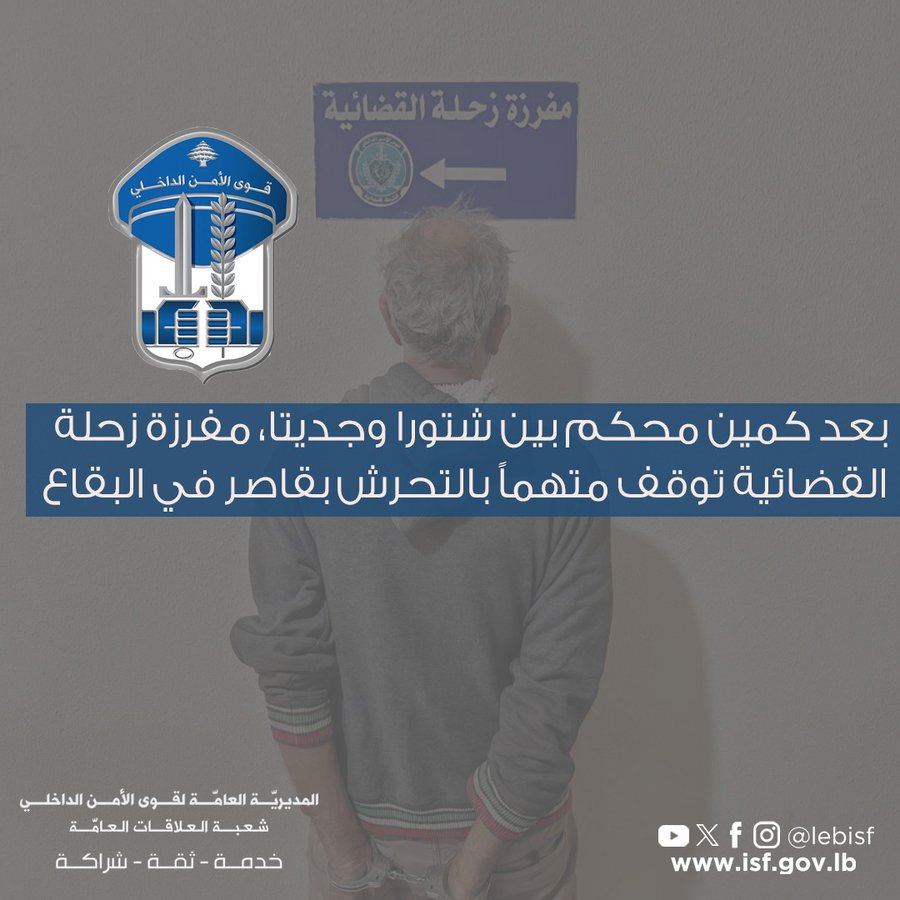 بنتيجة الاستقصاءات والتحريات المكثّفة التي قامت بها المفرزة، تبيّن أن المدعى عليه قد بدّل مكان إقامته. وبتاريخ 18-11-2025، وبعد المتابعة، تمكّنت قوة من مفرزة زحلة القضائية من تحديد مكان وجوده وتوقيفه على متن سيارته بكمين محكم بين بلدتَي شتورا – جديتا.