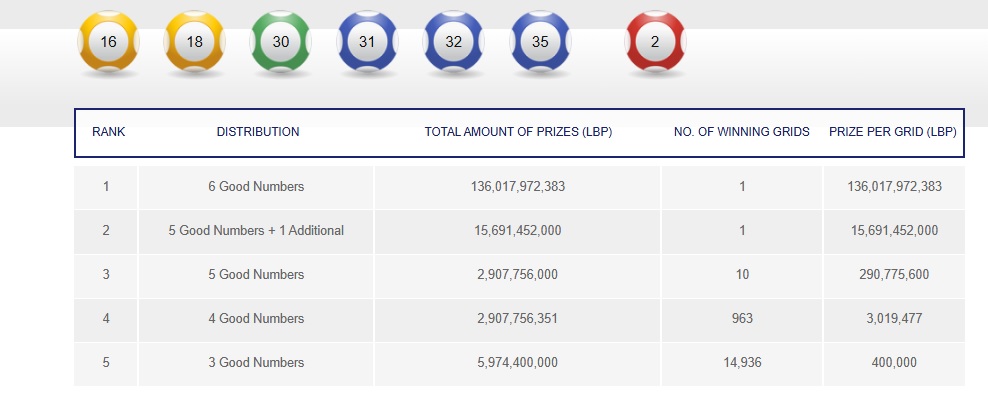 وتجدر الإشارة إلى أنّ الأرقام الرابحة هي: 16 و18 و30 و31 و32 و35، بينما الرقم الإضافيّ هو 2.