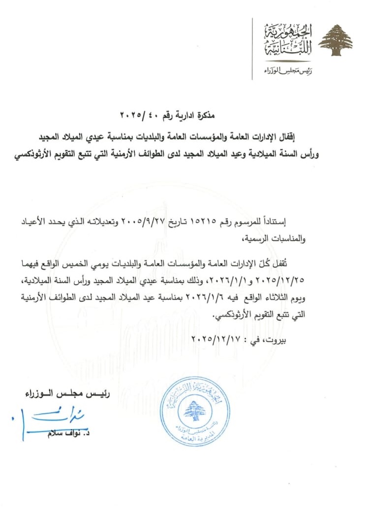 أصدر رئيس مجلس الوزراء نواف سلام ، مذكرة بإقفال الإدارات العامة والمؤسسات العامة والبلديات يوميّ الخميس الواقع فيهما 25-12-2025 و1-1-2026، وذلك بمناسبة عيديّ الميلاد المجيد ورأس السنة الميلاديّة، ويوم الثلاثاء الواقع فيه 6-1-2026، بمناسبة عيد الميلاد المجيد لدى الطوائف الارمنية التي تتبع التقويم الارثوذكسيّ.