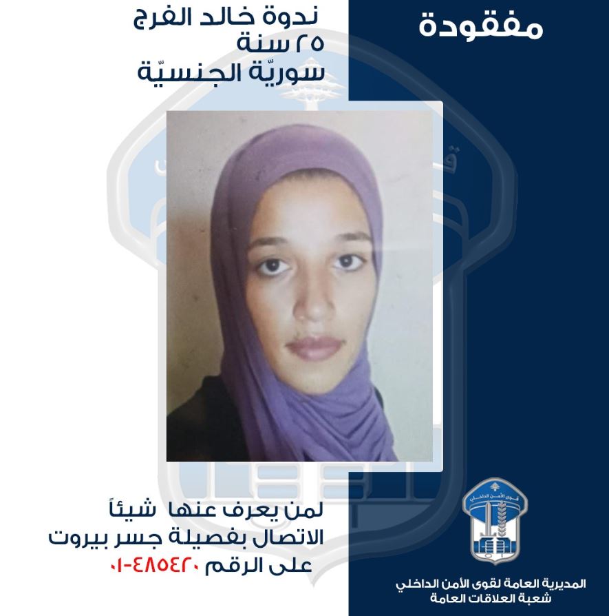التي غادرت بتاريخ 10-12-2025 منزلها الزوجي الكائن في محلة النبعة إلى جهة مجهولة، ولم تعد لغاية تاريخه