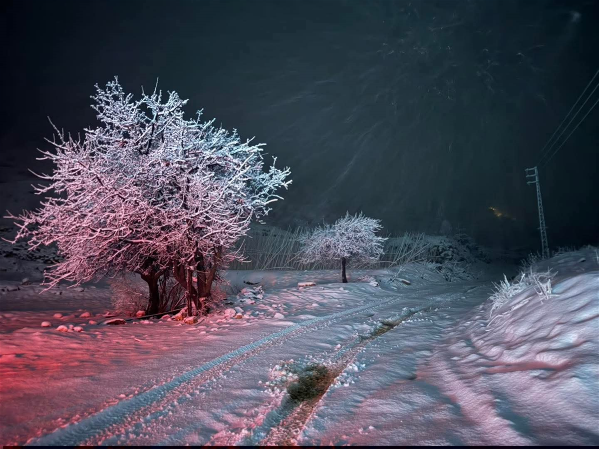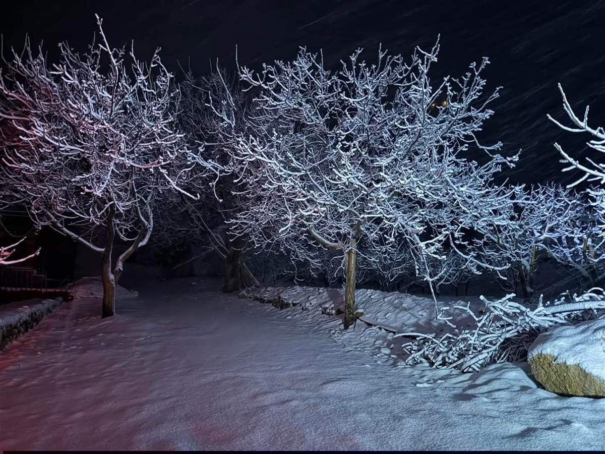 كذلك، برزت عبر الصور الأشجار التي غطتها الثلوج، بالإضافة إلى التلال التي أحاطت بها والتي ارتدت الثوب الأبيض.