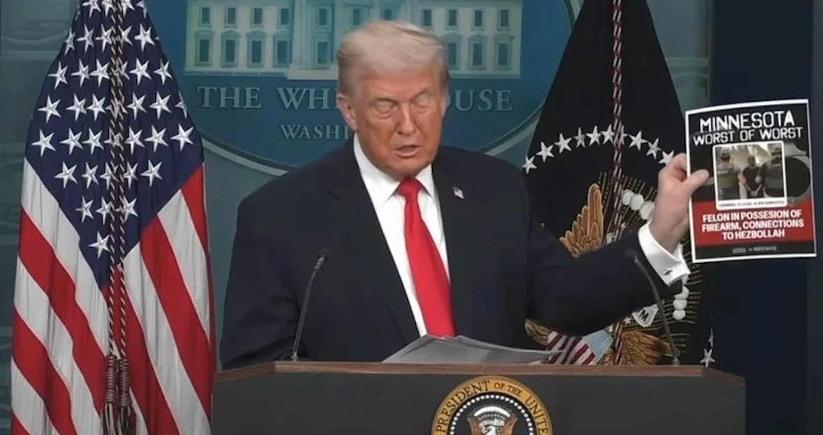 عرض الرئيس الأميركي دونالد ترامب خلال المؤتمر الصحافي بمناسبة مرور عام على ولايته الثانية، صورة أحد الموقوفين في ولاية مينيسوتا ، مشيرًا إلى وجود علاقة له بحزب الله.