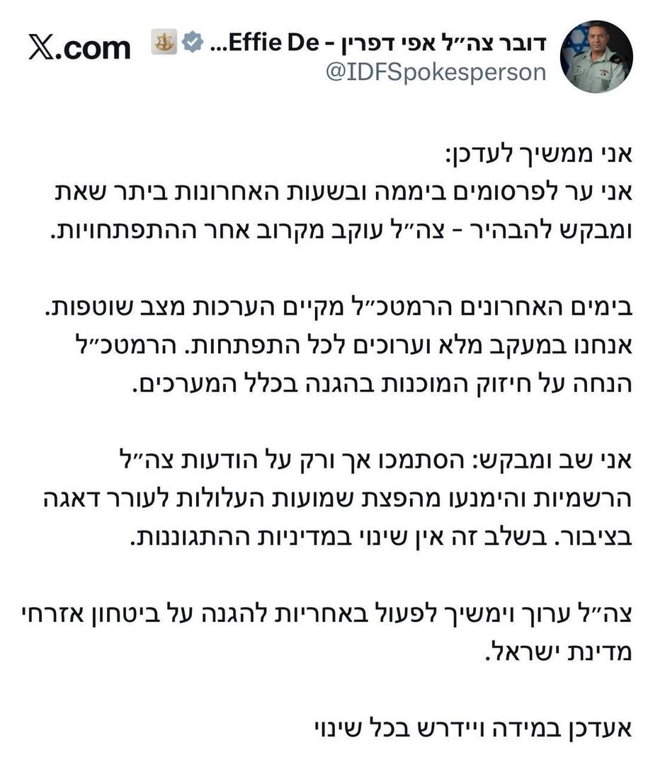 وأكد المتحدث أن الجيش الإسرائيلي مستعد وسيواصل التصرف بمسؤولية لحماية أمن الإسرائيليين، موضحا أن المؤسسة العسكرية ستصدر تحديثات إذا طرأت أي تغييرات.