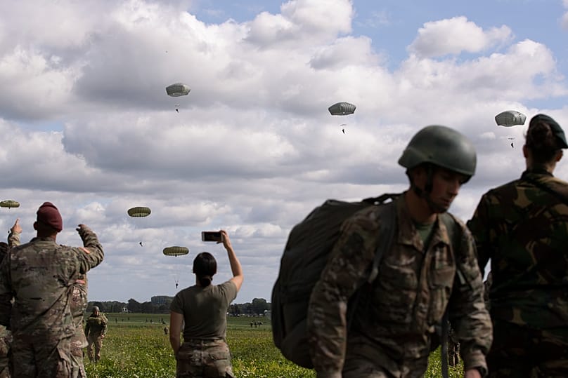 مصدر الصورة مظليون يقفزون من طائرة قرب غروسبيك في هولندا، الخميس 19 سبتمبر 2019، ضمن فعاليات إحياء الذكرى الخامسة والسبعين لعملية ماركت غاردن، AP Photo/Peter Dejong