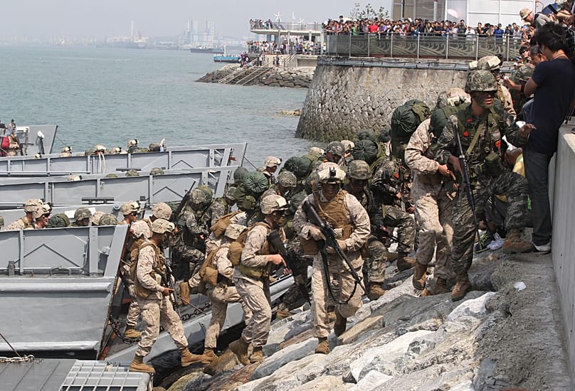 مصدر الصورة جنود أمريكيون بزيّ كاكي ومشاة البحرية الكورية الجنوبية يشاركون في مراسم إحياء الذكرى الـ63 لإنزال إنتشون، يوم الأحد 15 سبتمبر 2013 AP Photo/Ahn Young-joon