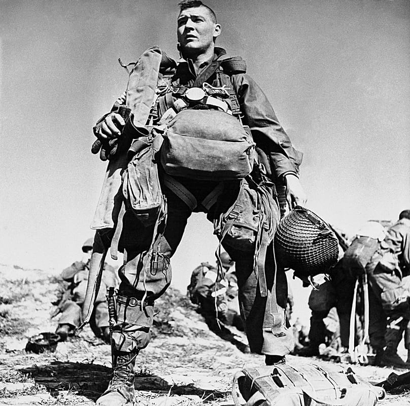 مصدر الصورة مظلي من الفرقة المحمولة جواً السابعة عشرة ينتظر الصعود إلى طائرة نقل في مطار خارج باريس بفرنسا، استعدادًا لبدء عملية فارستي في 2 أبريل 1945. AP Photo/Life/Pool/Robert Capa