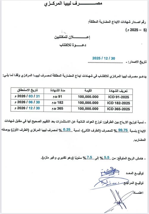أعلن مصرف ليبيا المركزي طرح الإصدار رقم (5-2025) من شهادات إيداع المضاربة المطلقة، داعيًا المصارف التجارية إلى الاكتتاب وفق الضوابط والإجراءات المعتمدة، وموضحًا أن تاريخ الإصدار سيكون 30 ديسمبر 2025.