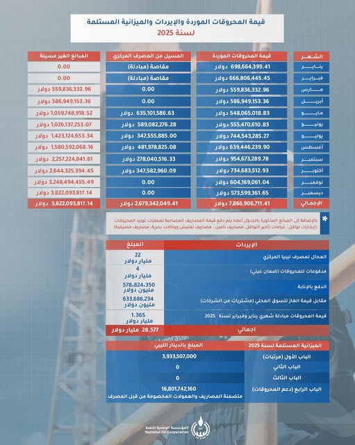 أعلنت المؤسسة الوطنية للنفط عن قيمة المحروقات الموردة والإيرادات والميزانية المستلمة والمبالغ غير المسيلة خلال سنة 2025.