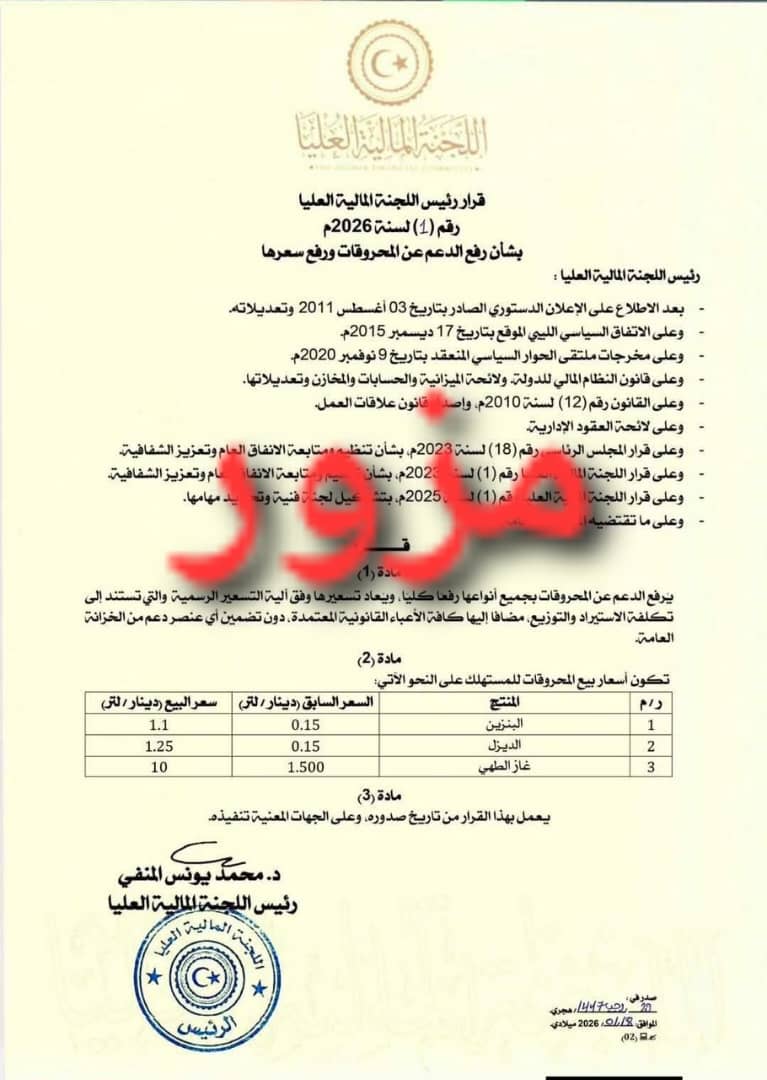هذا وتتناول الورقة المزورة التي تم تداولها على نطاق واسع قرارًا مزعومًا برفع الدعم عن المحروقات وتحديد أسعار جديدة للبنزين والديزل وغاز الطهي، وهو غير صادر عن أي جهة رسمية، ويُصنَّف على أنه أخبار مضللة تهدف إلى خلق بلبلة لدى الرأي العام.
