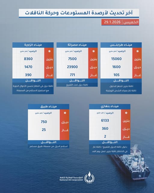 وفي ختام تحديثها، جددت المؤسسة تأكيدها على أن المخزونات الحالية في المستودعات “جيدة جداً”، وأن الفرق الفنية تعمل على مدار الساعة لضمان وصول الوقود من الموانئ إلى كافة المناطق والمدن الليبية دون تأخير، داعية المواطنين إلى عدم الانسياق وراء الشائعات التي قد تسبب ازدحاماً غير مبرر أمام المحطات.