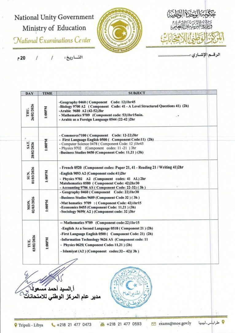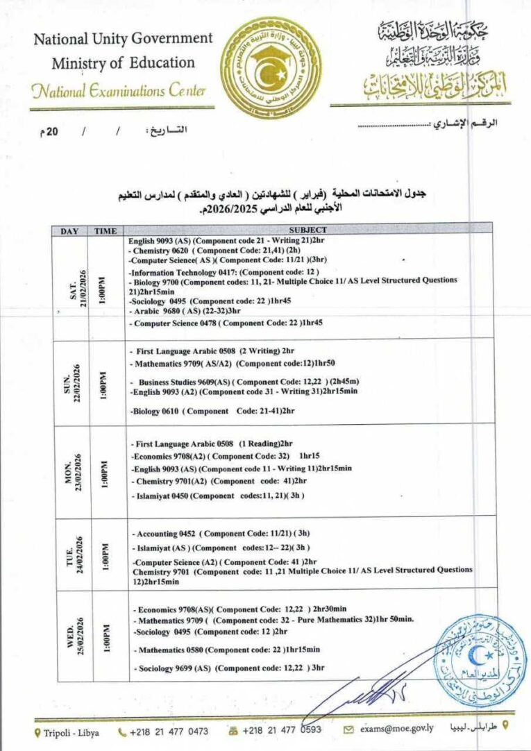 أعلنت وزارة التربية والتعليم بحكومة الوحدة الوطنية، عن جدول الامتحانات المحلية لشهر فبراير للعام الدراسي 2025 – 2026، للشهادتين العادي والمتقدم في مدارس التعليم الأجنبي.